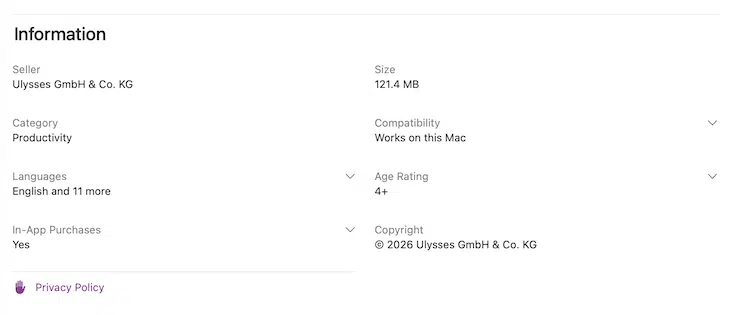 Below, see a copyright example from Ulysses, a one-stop writing app hosted in the Apple App Store.