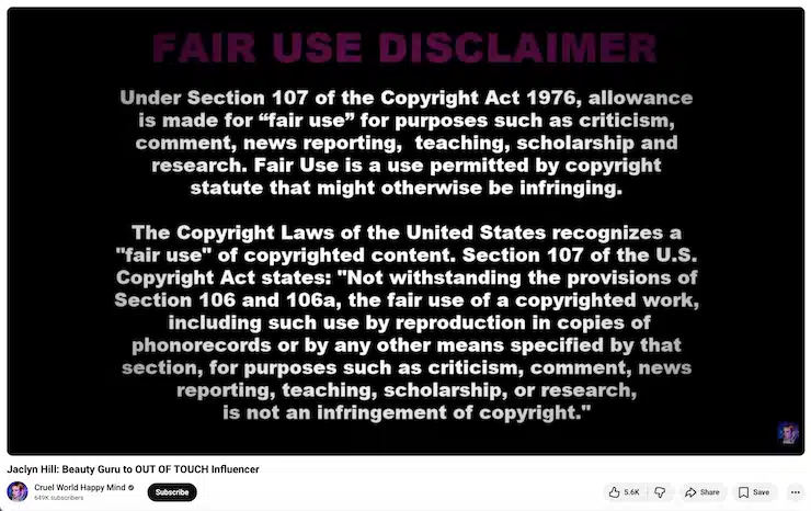 For example, the screenshot below from Cruel World Happy Mind’s YouTube video includes a fair use disclaimer because the creator features stills and footage from other creators.